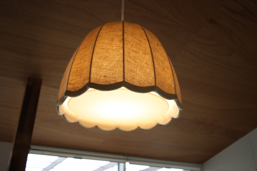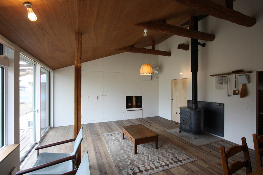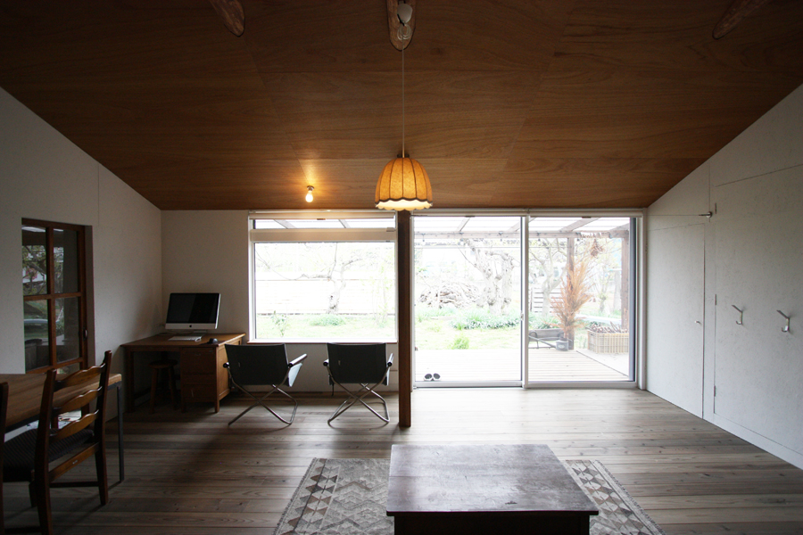 工事内容は主に窓サッシの取替え、断熱工事、床壁天井材の張替えです。天井を解体したところ松の梁材が思いのほか良く、それらを見せられるように元々予定していた平天井(水平の天井)から勾配天井(斜めの天井)に変更しました。床は杉のフローリングにウッドロングエコというハーブ、木の皮、鉄などが混じった粉を水に溶いた塗料を塗り、グレイッシュに仕上げました部屋中央のペンダントライトは「flame」さんのリネンのもので、これを見て毎日癒されています。